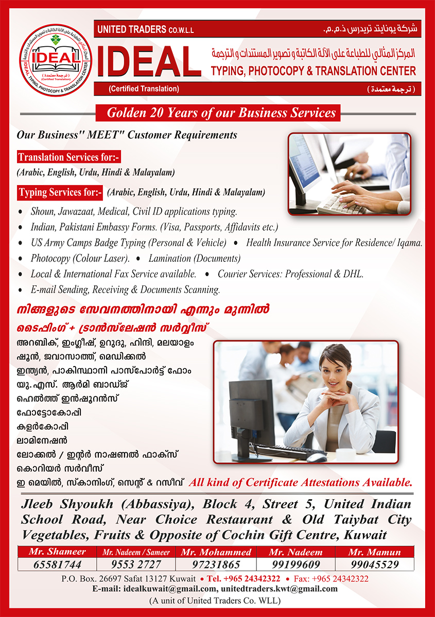 ইংরেজি, আরবি, মালায়ালম ও উর্দু টাইপ | পাসপোর্ট অফিস, Shuoon, সিভিল আইডি সেবা | মেডিকেল ও ফিঙ্গার প্রিন্ট অফিস সেবা | ভারতীয় ও পাকিস্তান দূতাবাসে ফরম স্কুল ভর্তি ফরম | কাজের অ্যাপ্লিকেশন সব ধরনের |